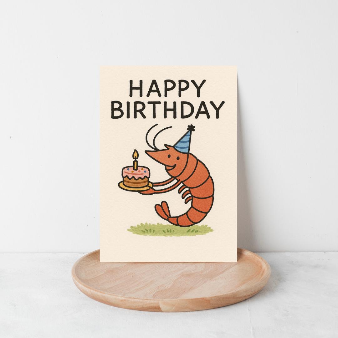 Cute Shrimp Birthday Card - Whimsical Crustacean Greeting Card - Quirky Happy Birthday Card with Cake - Unique Animal Card for Friends