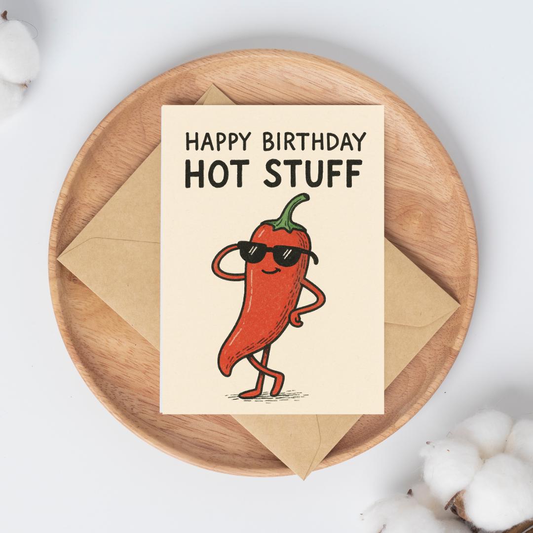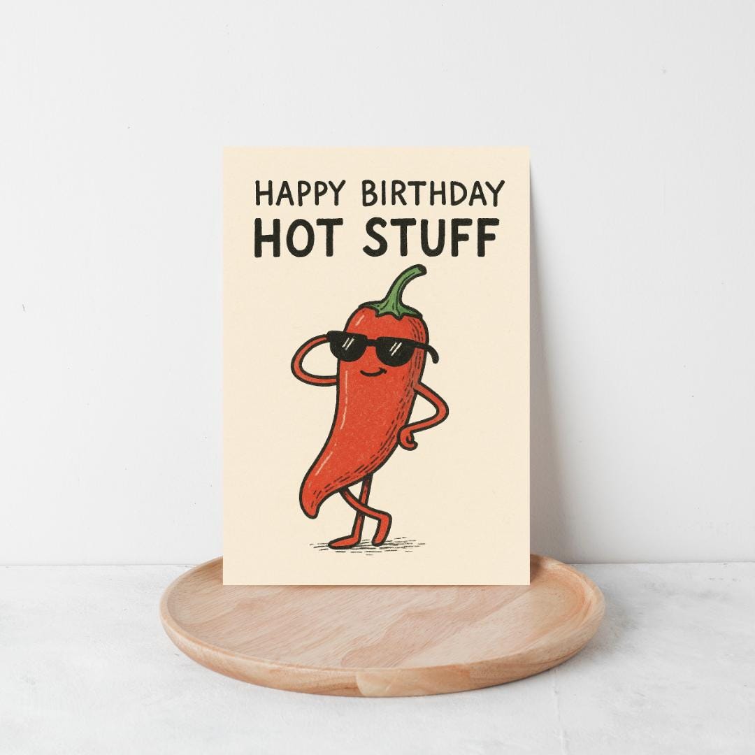Funny Birthday Card | Happy Birthday Hot Stuff Chili Pepper | Hand-Drawn Cool Chili Card | Quirky Pun Greeting Card for Him or Her